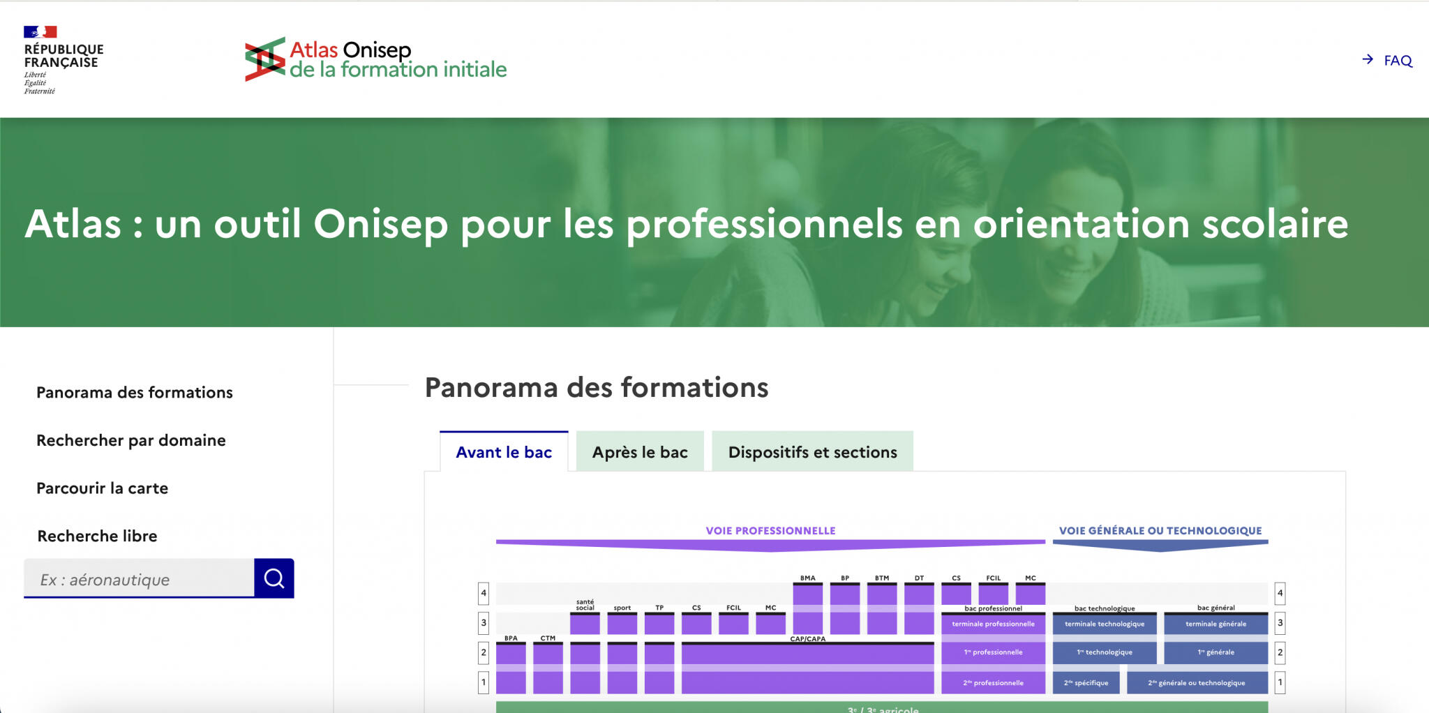 L’Atlas est mis à jour chaque semaine à partir des informations que nous collectons.Ces collectes sont organisées tout au long de l’année : soit lors de campagnes de collecte spécifiques, soit lors des décisions d’évolution des cartes scolaires.La recherche d’informations démarre via 4 entrées : des panoramas de formations cliquables (avant le bac, après le bac, dispositifs et sections), une entrée par domaine (agriculture, commerce…), une entrée par la carte de France (régions et départements) et une recherche libre. Grâce à la combinaison de ces critères et de nombreux filtres (nature du diplôme, langues, modalités d’enseignement, statut de l’établissement, hébergement, commune, académie…), les listes des résultats sont affinées. Les utilisateurs peuvent ainsi trouver des classes de 3e avec les langues enseignées, des classes de 1re et leurs enseignements de spécialité, des licences ou masters et les parcours proposés…